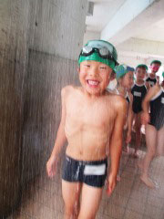 プールの水は冷たくなかったけれど、水のシャワーは冷たかった。5秒も数えられません。何とかシャワーをクリアーし、プールサイドへ。先生の指示を聞いて、バタ足をしたり、水の掛け合いをしたり、洗濯機みたいに皆が同じ方向に動いて流れるプールを作ったり。とても楽しかったです。苦手な子どもも、先生やお友達と一緒にちょっぴり頑張って大きなビート板の橋をくぐりました。できた時の笑顔が印象的です。