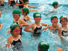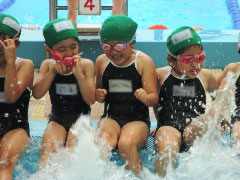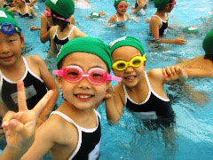 水泳教室が始まりました。1年生は今日が初日です。朝からプールバックを持って嬉しそうに登校してきました。着替え、体操、ビーチサンダルを履く、何をやっても「キャーキャー」と大騒ぎでした。