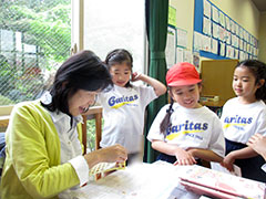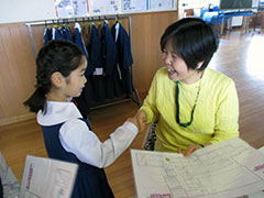 待ちに待った学校探検の日がやってきました。今までは、担任教師と一緒にクラスごとの列で校内を巡りましたが、今度は、地図を片手に自分達だけで広い校内をまわり、カリタスの先生方を探すという探検が始まりました。初日は、1年生担当の先生方5人に、挨拶を確認してもらいながらの練習。先生と握手をした後、シールをもらいました。翌日の朝からは、自由に校内を回りました。出会った先生方に自分で声を掛けるのは勇気のいることですが、何事も経験です。上級生も一緒にまわってくれたり、「大丈夫だよ」と応援の声掛けをしてくれました。「先生の好きな食べ物は何ですか?」「好きな色は?」「動物は何が好きですか?」自己紹介だけでなく、先生方に色々な質問もしています。「好きな色はピンクだって。私と一緒だった」と嬉しそうに子どもたちは報告してくれます。たくさんの先生方と出会い、カリタスをもっともっと好きになって下さいね。