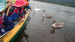 息を合わせてみんなでこぐと、大きなカヌーがスイーっと進み、気持ちよかったです。途中、山中湖に住み着いたという白鳥の家族も寄ってきてくれました。
