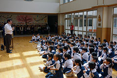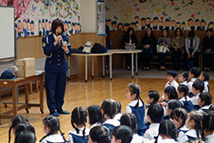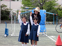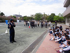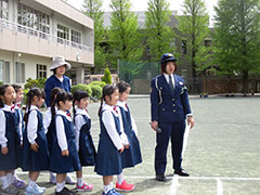 多摩警察署、多摩区役所の方をお招きして「交通安全教室」が開かれました。まずは、多目的ホールで警察官の方から交通ルールの指導がありました。道路で危険に遭遇しそうな子どもの絵を見て、「道路で遊んでいるのは危ないよ」「車がいつ来るか分からないのだから、飛び出してはだめだね」と気付くことができました。その後は、実際に校庭で歩き方の練習をしました。横断歩道は「右手をぴんと挙げ、右、左、もう一度右を確認して、安全なら渡る」「見通しの悪い路地は、立ち止まって安全確認をする」こともしっかり練習しました。保護者の皆様がお手伝いしてくださったお蔭で、実り多い交通安全教室となりました。