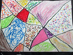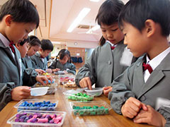 学習の最後に模様を描き、色塗りをしました。隣の部屋は別の色、別の塗り方になるよう、1年生なりに考え、色を付けていきました。完成した個々の作品も美しいですが、全体で眺めると、どこの芸術家の作品かと勘違いしてしまいそうなくらいです。