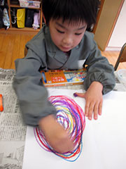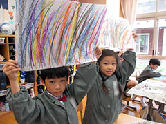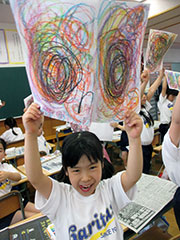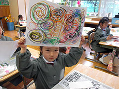 いつも身近にあるクレヨンも、色々な使い方を知っていれば世界が広がります。そんな楽しさを味わってもらうため、1年生ではクレヨンの指導を毎年行います。濃淡を付けて描くことやクレヨンをねかせて描くこともその1つ。このような手法を学ぶため、蚊と蚊取り線香のストーリー仕立てで授業を組み立てました。蚊取り線香に見立てた「ぐるぐる描き」、その蚊取り線香の効果が発揮され、今にも息絶えそうな蚊。それを各自が考え表現しました。クレヨンをねかせて「下から上に向かって」描いたとき、あまりの美しさに子どもから「うわあ、綺麗」という声も挙がりました。