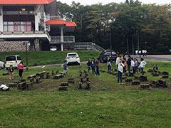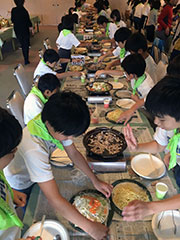 全員元気に予定通りホテルライジングサンに到着しました。開校式を終えて、お昼ご飯は、グループ毎に焼きそば作りです。