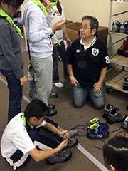 宿につき、開校式の後は早速トレッキングシューズの履き方講習会です。