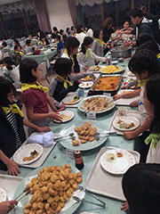 いよいよ楽しみにしていた夕食の時間です。パイキング形式ですので、各自が食べたいものをお皿によそいます。事前に、エネルギーになるもの、体を作るもの、体の調子を整えるものを摂ることの大切さの話を聞いていたので、皆バランスよく食事を取ることができました。食事が終わると自ら食器を運び、テーブルを拭く働き者の男子には感心しました。
