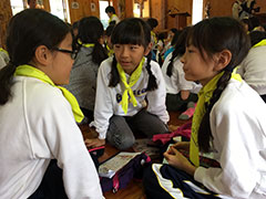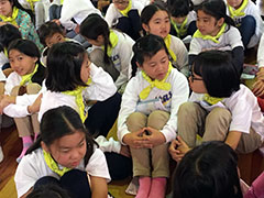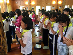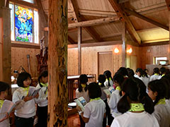 午前は、妙高教会で宿泊活動の振り返りをしました。担当の子どもたちの進行で、思い出や学びを友達と分かち合いました。「苗名滝がすごい迫力だった」「ハイキングでザトウムシやバッタを捕まえたよ」「ブナの森は水を蓄えてくれるから、大切にしたい」など、様々な振り返りがありました。