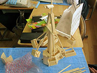 集めてあった学校の竹の子の皮を自由に使って、「髪飾り・バッグ・舟・クジャク・ブックカバー・包み箱」など楽しんで作りました。竹の子に興味がある子どもたちは、竹の子の皮はどうなっているのかなと、竹林に行ってみましたが、ありません。「きっと、土の中・風で飛ばされたかもしれない」と予想しました。少しの竹の子の皮では作品が作れません。買ってきた皮を使い、工作用紙で作った箱の周りに小麦粉を溶かして貼りましたが、白くなったりすぐはがれ落ちてしまったり。次回(1月)もう一度取り組むことにしました。