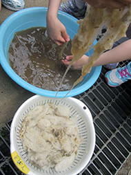 クロちゃんの毛をいただいた子どもたちは、それを見ながらクロちゃんのどの部分に生えていた毛なのか予想したり、毛先と根元の方の違いに気づいたりもしていました。羊毛一本は「すごく細い」「髪の毛より細い」「透明みたいな白」「パーマヘアーみたいにくりくり」だとわかりました。そして、ゴミが付いていること、油でべとべとなことに気付き、作品作りのために羊毛を洗う活動が進んでいます。