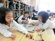 まだ300個以上残っていたくるみ。ほかのお菓子にしてみたいな…と思っていましたが、時間がありませんでした。1時間でせっせと割って、中身を出して…3月に再びクッキーを作りました。今回は6年生のペアのお姉さんが1年間研究した「だし」とクッキーを交換して味わいました。ほかに6年1組と3組、1年1組と3組全員にも1枚ずつクッキーを食べてもらうことができました。多摩川のくるみのおいしさを伝えられたかな…?