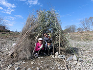 多摩川探検には、1月、3月に出かけました。幸い2回ともまぁまぁの天候で、みんなふるえることもなく、元気に探検することが出来ました。茶色い枯れ草がいっぱいの河原に散らばっていき、木登り、石投げ、枯れ草の上で飛び跳ねるトランポリン、石拾い、草すべり、秘密基地作り…。ほかのグループと基地をつなげて大きくしたり、実家と嫁ぎ先?を作ったり…葉っぱでお料理をしたり、バーベキューをしたり、レストランを開いたり…どんどん新しい遊びが生まれていました。池では小魚やぬまえび、どじょうをつかまえた子たちもいました。3月の池にはカエルの卵があちらこちらに…!争うようにさがして、手ですくい上げる子もいました。何回行っても、もっともっと行きたい多摩川。2年生になってまた春の多摩川に行くのが楽しみです。