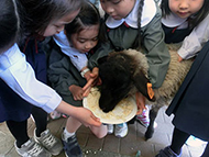 朝の当番表を作ってから、忘れずに動物当番に行ける子が増えました。1月に「クロちゃんは体が少し小さいし、毛の生え方が今ひとつ密でない」と牧場の方に指摘され、何かできることはないかを話し合いました。夕方の食事時間は一足先に小屋に入って、多めに食べられるようにする作戦にしました。3月には一旦牧場に帰るクロちゃん。みんなと教室で写真を撮って、お散歩をして、おからケーキを食べさせてあげて見送りました。トラックに乗り込むクロちゃんを見て涙を流す子がたくさんいました。三頭がいなくなった小屋やケージは寂しくて…1年生の生活に三頭はすっかり溶け込んでいたことが感じられました。