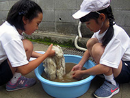 クロちゃんの毛をいただいた子どもたちは、それを見ながらクロちゃんのどの部分に生えていた毛なのか予想したり、毛先と根元の方の違いに気づいたりもしていました。羊毛一本は「すごく細い」「髪の毛より細い」「透明みたいな白」「パーマヘアーみたいにくりくり」だとわかりました。そして、ゴミが付いていること、油でべとべとなことに気付き、作品作りのために羊毛を洗う活動が進んでいます。