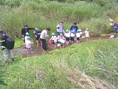 湧き水の沼では、たくさんの子どもたちが水の中に入って、生き物を捕まえていました。