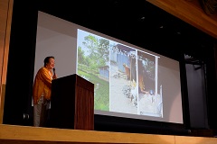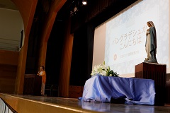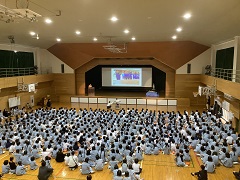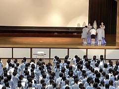 クラスの代表がユリの花を献花し、共同祈願を行った後、ESA(アジア教育支援の会)の辻さんから、支援先の学校の様子や現地の食文化についてお話を伺いました。