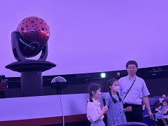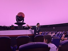 科学館の内藤さんは、カリタス小学校の景色をプラネタリウムに写してくださり、今日の夜カリタス小学校の校庭では、どんな星が見えるか紹介してくれました。今、理科で星の動きを学んでいることもあって、「知っている星の名前や星座が分かる!」と歓声があがっていました。