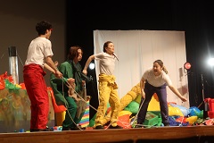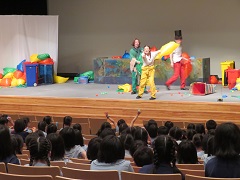 ゴミ問題、環境問題をテーマに、身体表現やダンス、ダブルダッチなど様々な仕掛けを盛り込みながら展開していく劇でした。台詞がほとんどないため、子どもたちは動きや表情からそれぞれいろいろなことを考えながら見ていました。ダンスやダブルダッチのシーンでは、音楽にのって手拍子が起こり、技が決まると歓声があがりました。