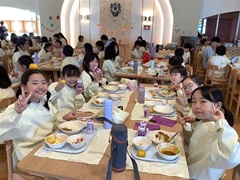 さすが4年生。3年生を楽しませてくれる粋な演出に、この笑顔。ハロウィンメニューをおいしくいただき、楽しい時間を過ごすことができました。