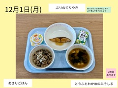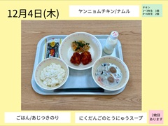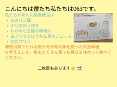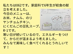 今年も6年生は、家庭科の授業で「一食分の献立を考えよう」という学習で、給食の献立を考えました。2学期の授業のはじめにグループに分かれて献立を考え、発表をしてクラスで1つ選びました。12月1日、4日、8日に実際に給食に登場しました。