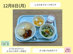 8日は、1組が考えた献立で、クラスで人気のポトフと衣にチーズが入っている唐揚げと豆乳パン、フルーツ白玉というみんなの大好きが詰まったものでした。