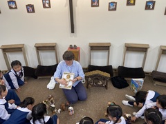 1年生の宗教の授業では、クリスマスについて学び、イエスさまがお生まれになった「馬小屋」を再現しました。