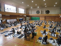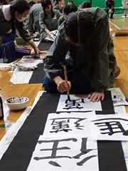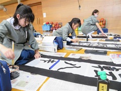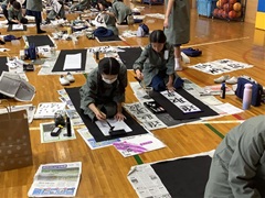 1月、5年生全員が体育館に集まり、書き初めをしました。書く文字は、全部で四文字。新年を迎えた時から、今年の抱負になる四字熟語を探して、書きたい四文字を考えました。