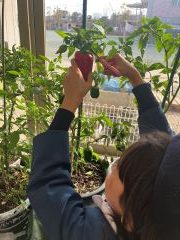 冬になっても野菜は順調に実り、全員がもう1回ずつミニトマトを食べました。味は甘い人と酸っぱい人、両方いて、表情から天国と地獄ほどの味の差があったようです。2月にはお店で売っているような大きなピーマンもできました。そのまま枯れると思っていた野菜ですが、春が近づき、新しい葉が出てきたので、ほしい人が持ち帰り、自宅で育て続けることにしました。乾燥していたポップコーンもみんなで食べました。猛暑の影響で粒が小さかったですが、味はしっかりポップコーンでした。