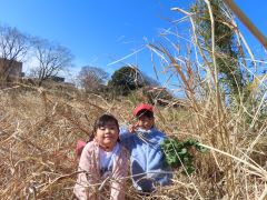 3学期は、1月と2月に多摩川探検に出かけました。真冬の多摩川は、それまで鬱蒼と生い茂っていた草花が枯れ、暖かい時期に見かけていた生き物たちの姿もあまり見かけなくなってしまいますが、見晴らしがよくなったぶん、みんなの活動範囲がぐっと広がって、秘密基地を作ったり、行ったことのない場所に足を踏み入れて新しい場所を開拓したりするグループが増えました。一方、相変わらず湧き水の場所は人気で、一年を通して小エビや小魚を捕まえる子がたくさんいました。虫取り網やペットボトルなどのシンプルな道具の他は、多摩川にある石や草花や蔓、木の枝を道具として上手に使って遊びます。立派な「たんけん名人」になりました。2年生になったら、どんな多摩川探検が待っているかな。
