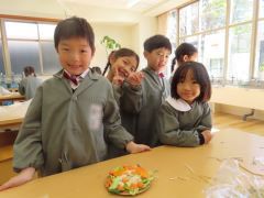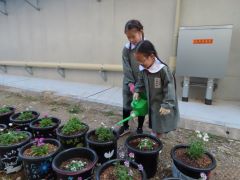 最後にもう一つ、子どもたちは「土いじり名人」でもありました。中庭と植木鉢でタマネギとジャガイモを育て、4月に入学してくる新入生のために、1人1鉢チューリップを育てています。冬の間は成長が止まったようだった植物たちも、立春を過ぎて寒さが緩む日が増えてきてからは、芽を出し、草丈を伸ばし、葉っぱが強く元気になってきました。どんな小さな成長も見逃さず、休み時間から帰ってくると「チューリップの芽が出ていたよ!」「タマネギの葉っぱが増えてた!」と教えてくれる子どもたちでした。2年生になって春を迎えたら、たくさんの草花と土から出てきた生き物たちといっぱい遊べるね。手も靴もどろんこにして遊ぶ子どもたちの姿が、今からとっても楽しみです。