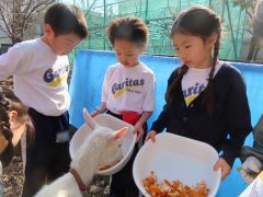 冬休みが明けて、ますます寒さが厳しくなる中でも、毎日ヤギのゆきちゃんとの生活は続きます。朝の動物当番では、頬も指先も真っ赤になりながらうんち掃きや、すのこ洗いに励み、休み時間にはゆきちゃんとカリタスの森をお散歩したり、ゆりの木広場で2年生の動物たちとふれ合ったり…2年3組の教室の前には、ヤギのゆめちゃんのために作られた「ゆめちゃんランド」があり、ゆきちゃんはそこが大のお気に入りで、ゆりの木広場まで行くと、必ずそこから離れなくなってしまいます。