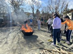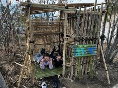 3学期は、それぞれのチームが目指してきたものが形になっていきました。家チームは思い描いていた窓や床作りを完成させ、竹の花だんのチームは少しずつ花を増やし、毎日の水やりを続けました。茶道チームは、2学期に茶杓づくりが難航したため、ガスコンロではなくロウソクで一点を熱し、竹を曲げる工夫をしました。その技術を健康器具チームが教わり、まごの手ができました。また、家チームの電動ドリルの技術を花だんの竹オベリスクづくりに応用したり、竹炭チーム作った炭は花壇の土壌改良にも利用したりと、チーム間でも協力する姿がみられました。