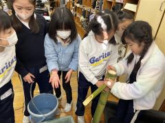 3月になっても子どもたちの意欲は終わることがなく、竹林整備に行って個人の作品作りをして持ち帰ったり、作った竹炭から墨を作って半紙に描いたりしました。うぐいす笛を友だちに紹介した一人の発表から竹に興味をもち、こんなに活動が広がっていくとは、だれも想像することができませんでした。
