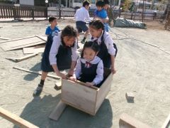遊園地のお片づけに入ると、出ている釘を抜いたり、ゴミ捨て場にみんなで持っていったりしました。片づけまで自分たちの力で、と考える姿、とても素敵でした。