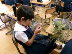 4年2組は今、自然遊びの研究を進めています。自然遊びとは、校庭や公園などにある草や花、石、砂等を使った遊びです。ボールやゲームなど「作られたもの」ではなく、自然の恵みを生かして遊びを考える事を楽しんでいます。