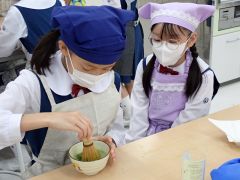 ⑤茶道具づくりの合間に一度お茶を点てる練習をしました。自分が点てたお茶を隣の友だちに飲んでもらいます。これまで2度体験をしてみたものの、お湯の量の調節や、練習したはずの手首の動かし方がうまくいかずになかなか泡いっぱいにするのは難しかったようです。