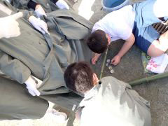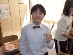 ④2学期の最後は「竹の油抜き」の作業。茶杓をつくるための準備です。初めは校庭で行ったのですが、少しの風でもろうそくの炎が消えてしまうので、レンガを見つけて置いたり、スモックをかざしたりと風が来ない工夫をどんどんしていく姿は、まさに「これぞ総合」でした。結局理科室に移動し、ようやく思うような活動となりました。