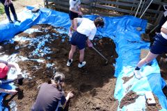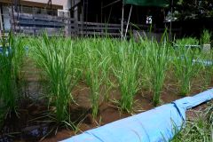 やがてバケツ稲だけでなく、「学校の中に田んぼを作って育てたい」という思いが生まれ、校内の使っていない池や畑を大改造して田んぼに作り変える作戦が決行。水を抜いて土を入れ、少しずつ混ぜながら水を入れ、肥料を混ぜて・・・。相手は植物ですから時期を選んでいられません。ゆっくりとしていると田植えの時期も逃してしまいます。田んぼができると急いでみんなで田植えを開始。何人か田植え体験をした子どもたちが自身の経験をいかして、より上手にできる田植えの方法を見いだしながら横一列になり、もらった苗を丁寧に植えていきます。靴を脱いで入る田んぼはなんだか不思議な感触。泥の感触が少し気持ち悪い。でもしばらくすると「気持ちいい」という声も聞こえてきました。一方で、暑い中、腰をかがめてする田植えは骨の折れるような作業です。手も泥だらけになります。ですが、体を動かすことで感じることができる米農家の方々の苦労がそこにはありました。