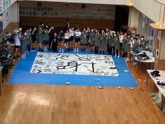 一方で、書道の時間をとって、筆文字で自分の好きな言葉や、興味のある書体の文字、イラストや外国語(アルファベットやハングルなど)も書いて(描いて)みました。どれも個性的で楽しい作品が並びました。カラーも入れると華やかになるという感想もありました。一番みんなの思いを表現できるメッセージを考え中です。