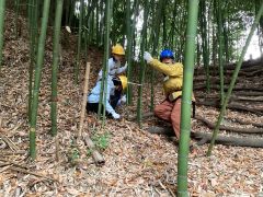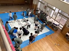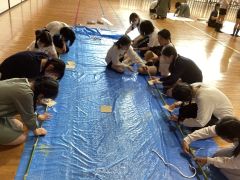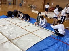 映像で高校生の書道パフォーマンスを見ていた子どもたちは、最終的にそれなりの大きな紙に書くことを考えています。半紙をつなぐだけでは到底足りず、模造紙をつないでこれくらいかなという大きさになるには20枚が必要でした。紙だけではありません。その下のブルーシートも張り合わせて作り、太い筆、大量の墨、掃除のための雑巾、新聞紙。さらに最後に紙を立ち上がらせるための支柱も必要でした。どうしようか迷っているときに、竹を使った総合活動をしている3年1組と4年1組がお世話になっている川崎市公園緑地協会の方に声をおかけしたところ、クラス全員で竹林に行って、細くて真っすぐな4mの竹を伐採し、支柱として提供していただくことができました。感謝です。その竹の節にヤスリをかけて丁寧に磨き、紙の裏に接着して持ち上げます。しかし大きな紙だけに紐で両脇からひっぱらないと、紙が破れてしまうこともわかってきました。