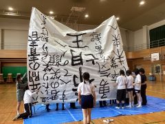 でもやはり、何かを作りたいという気持ちを持っている人と、平行線のまま話し合いの時間が続きました。それでも根気よく話し合って、書道パフォーマンスでダンスを充実させるという合体案が出され、それを支持する人が増えていき、最終的には書道の道具は奥が深いので、紙や筆や墨について調べて作る活動もできるのではないかと全員が納得して、テーマは「書道パフォーダンス」に決定しました。ダンスや書道の楽しさ、周りの人への感謝を伝えていこうというメッセージが込められています。総合デーでは外部の方や、お家の方に見てもらうこともできました。これからやりたいことがたくさんあります。昨年の食品サンプルでは、世界の平和を考え、カリタスの愛の大切さを伝えたいという気持ちで取り組んでいきました。2学期からダンス、書道ともに本格的な活動が始まりますが、今年も、クラス全員で協力して、周りの人に愛を伝えていける活動になるようにがんばっていきたいと思います。