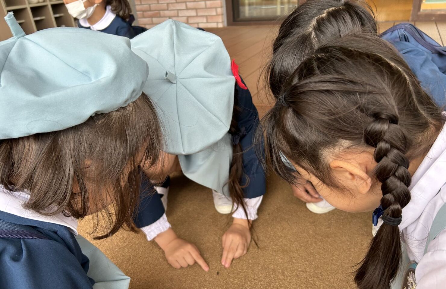登園してすぐに見つけたダンゴムシを、みんなで寄り集まって観察しています。ちいさいものを見つける名人です。