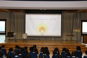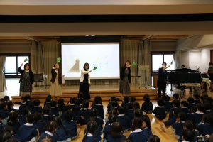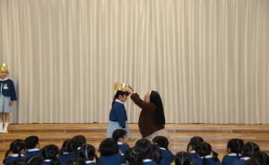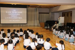 年中児がクリスマス会で行うので、子どもたちは真剣に聴いていました