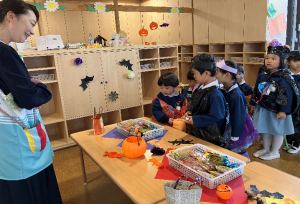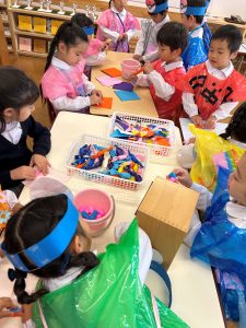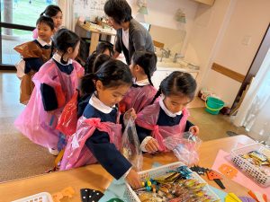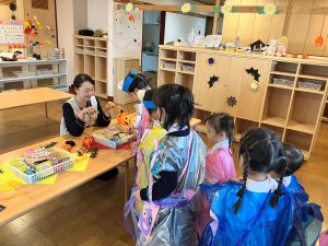 子どもたちは自分で作った衣装を着て、預かり保育の先生からお菓子をもらってニコニコでした