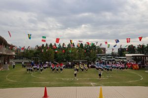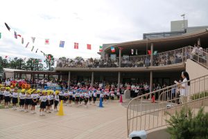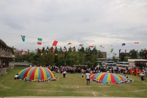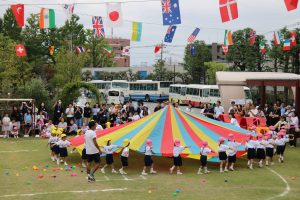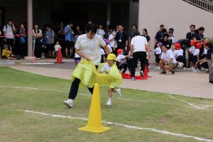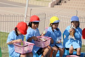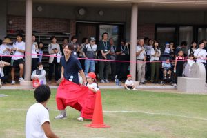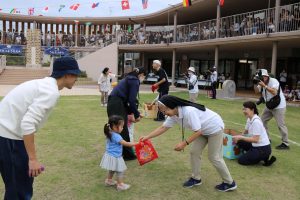 シスターからお土産をもらってニコニコ 年少児親子競技 『親子で一緒に』よーいドン‼